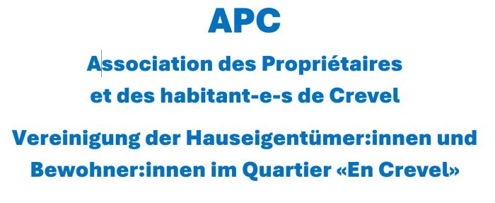 | DATES 2026: Séances du Comité : 15 mai, 18 juillet et 24 octobre 2026 Vous pouvez transmettre vos questions et demandes deux semaines avant les séances en vous adressant à l’un des membres du Comité. Apéro-rencontre : 15 mai 2026 à 17h Chez Beatrice et Beat Graf (-Aebischer), rte de Crevel 95. Une occasion de faire connaissance, de bavarder et d’aborder différents sujets qui concernant le quartier En Crevel. Vous êtes toutes et tous chaleureusement invité-e-s. Assemblée générale de l’APC : 18 juillet 2026 à 17h À la buvette du Centre sportif suivie d’un apéro et d’un repas. Sortie d’automne : samedi 24 octobre 2026 après-midi Informations à suivre TERMINE 2026: Sitzungen des APC-Vorstands: 15. Mai, 18. Juli und 24. Oktober 2026 Sie können Ihre Fragen und Anregungen zwei Wochen vor den Sitzungen an ein Vorstandsmitglied übermitteln. Apéro-Treff: 15. Mai 2026 um 17 Uhr Bei Beatrice und Beat Graf (-Aebischer), Rte de Crevel 95. Es ist eine Gelegenheit Leute zu treffen, zu schwatzen und gemeinsam Fragen zu unserem Alltag im Crevel zu diskutieren. Sie sind herzlich eingeladen. Generalversammlung des APC: 18. Juli 2026 um 17 Uhr In der Buvette des Fussballclubs. Im Anschluss daran Apéro und Essen. Herbstausflug: Samstag 24. Oktober 2026 nachmittags Informationen folgen |